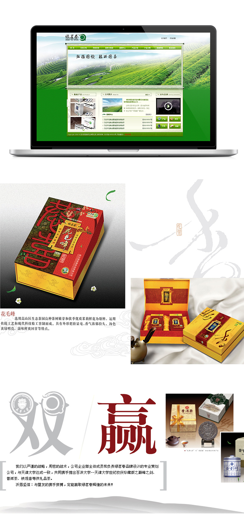 公司以四川农业大学、四川省茶科所等科研院所的技术、信息为依托,现已开发生产的 “绿茗春”牌生态绿茶系列产品主要有:巅峰之剑、雀舌、绿芽、绿针、绿毛峰、绿茗香、 雨前春、玉露春、绿茶特级等;“绿茗春”牌茉莉花茶系列产品主要有:飘雪、花毛峰、 茉莉香茗、浓香型茉莉特级、茉莉花茶特级、一级等。两大系列产品十余品种近六十个包 装规格产品,该产品具有绿、香、醇、鲜之纯天然特点,配以手工礼盒、铁盒、复合袋等 包装形式,典雅美观、盒形考究,是居家、茶楼、茶坊消费和馈赠亲友之佳品。